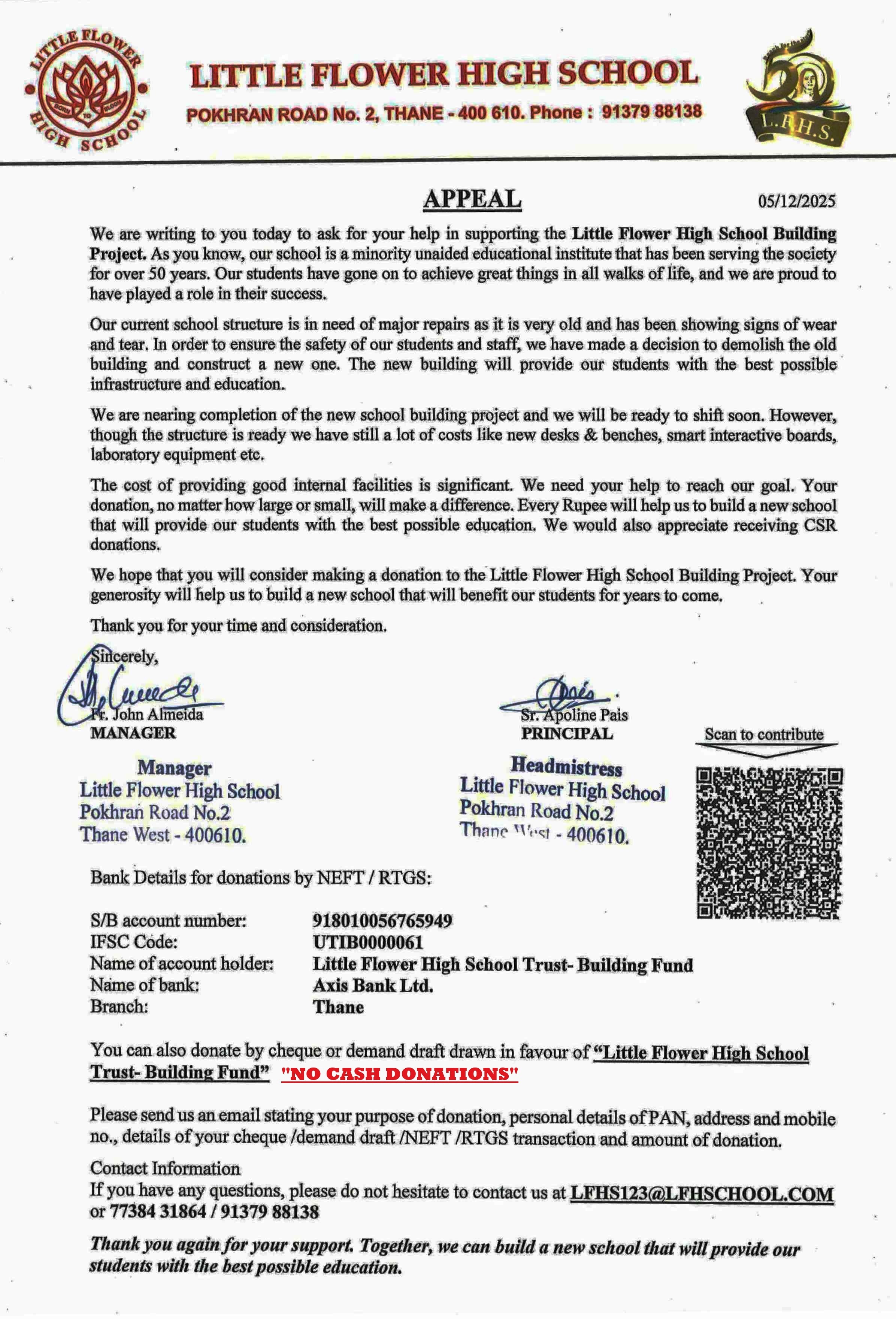 Little Flower High School, an English medium co-educational school was established in the year 1972 by Late Rev. Fr. Valerian Goudinho, with a view to cater to the educational needs of the children of the industrial laborers residing in the locality. As there were no good English medium schools in Vartak Nagar and Pokhran, the parents were compelled to send their children to far off schools in Thane City. There was a lot do inconvenience then, as the frequency of bus service was very poor. Late Rev. Fr. Valerian Goudinho took up the mission to establish a school.